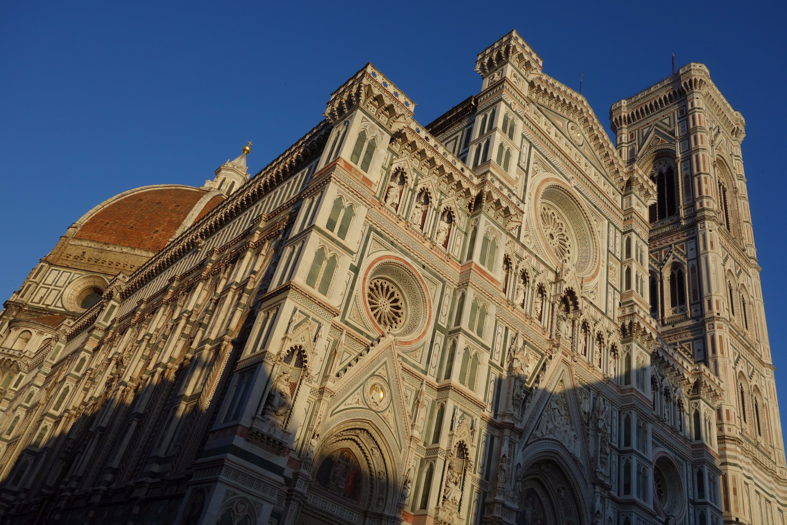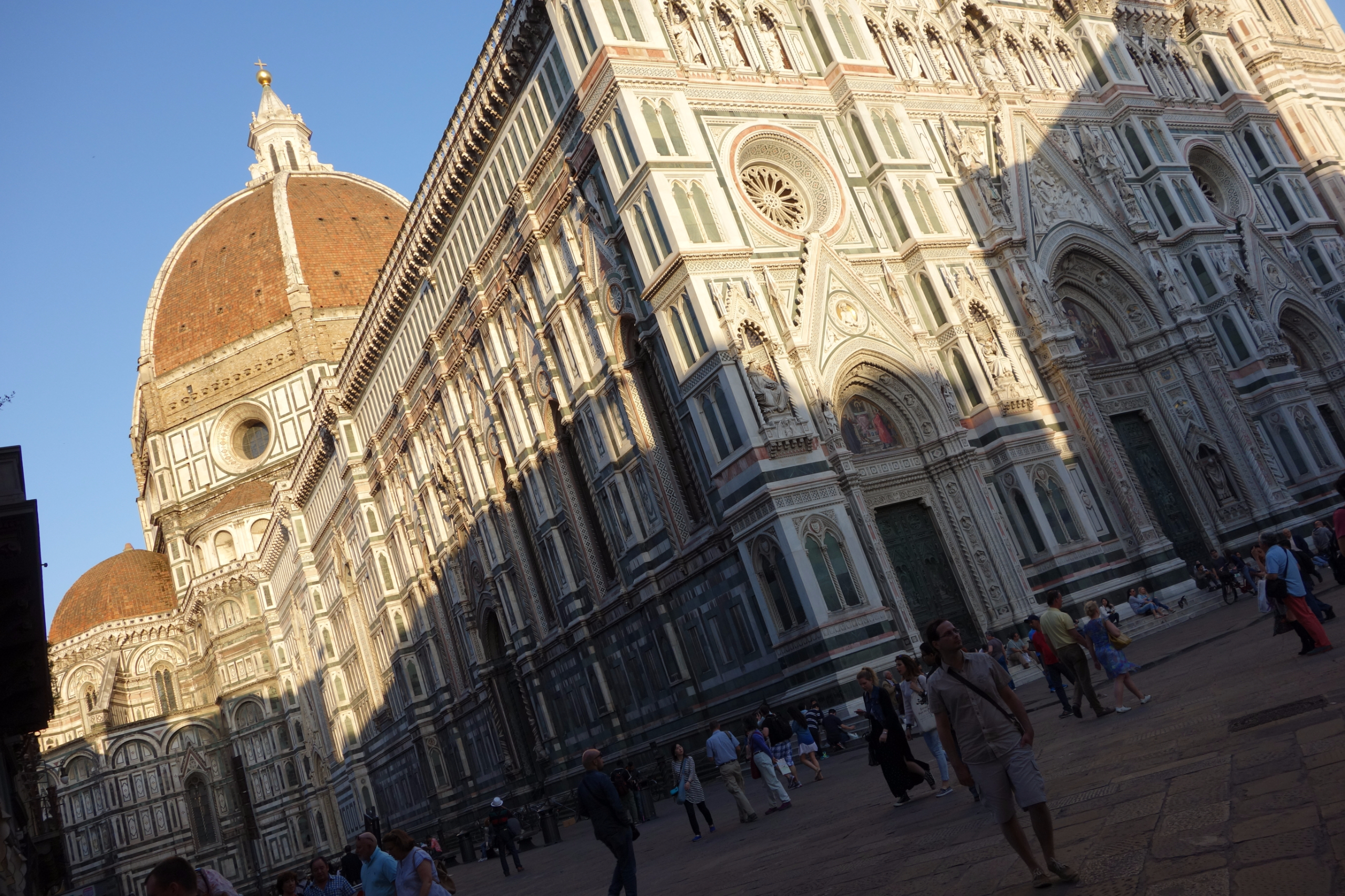 Кафедральный собор Санта-Мария-дель-Фьоре настолько огромный, что никак не хотел влезать в кадр… А больше всего впечатляет резная облицовка храма, выполненная из мрамора светлых тонов. Собор строился с 1296 по 1436 года.