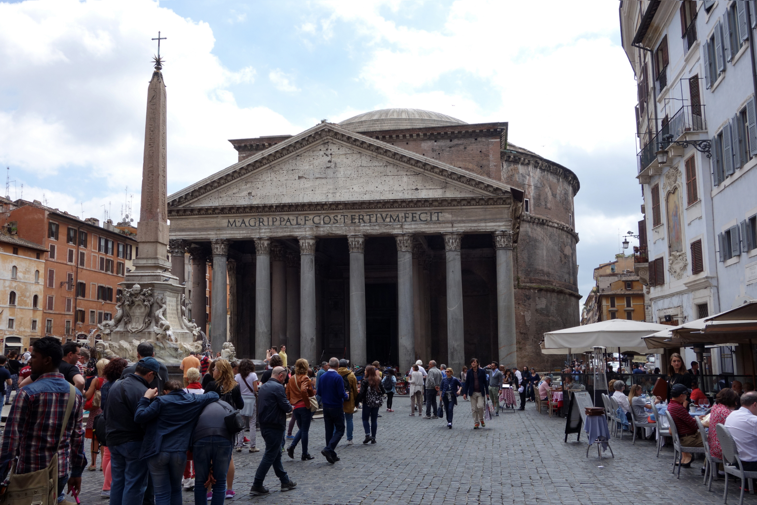 Надпись на фронтоне гласит: «М. AGRIPPA L F COS TERTIUM FECIT», что в переводе звучит как: «Марк Агриппа, сын Луция, избранный консулом в третий раз, воздвиг это»